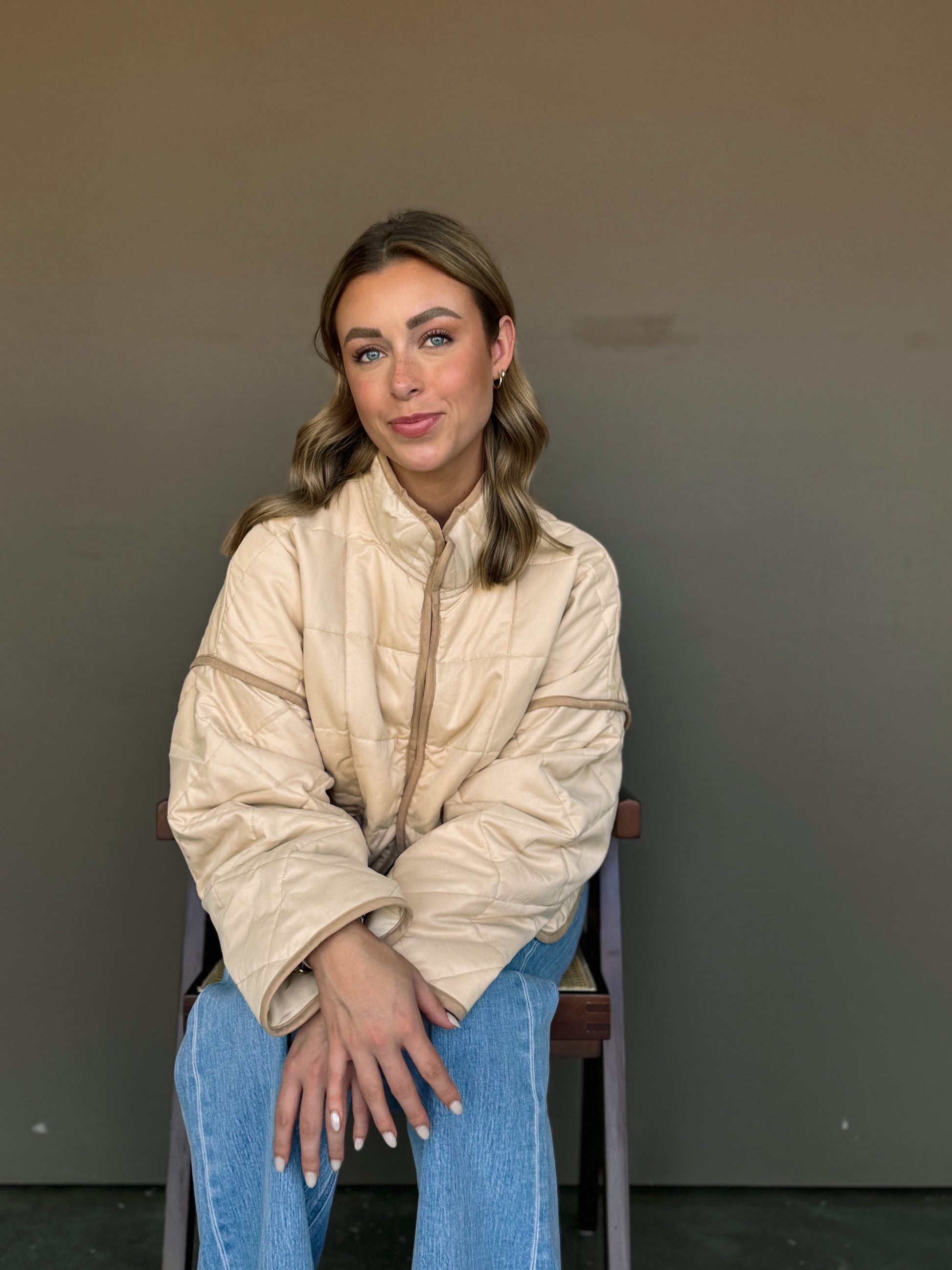 Stay cozy and chic in this lightweight quilted jacket, designed for effortless layering and everyday wear. The soft sandstone hue pairs beautifully with any outfit, while the relaxed silhouette and subtle curved hem give it a modern, feminine feel. Oversized sleeves and a stand-up collar add both comfort and style, and the front patch pockets keep your essentials within easy reach.